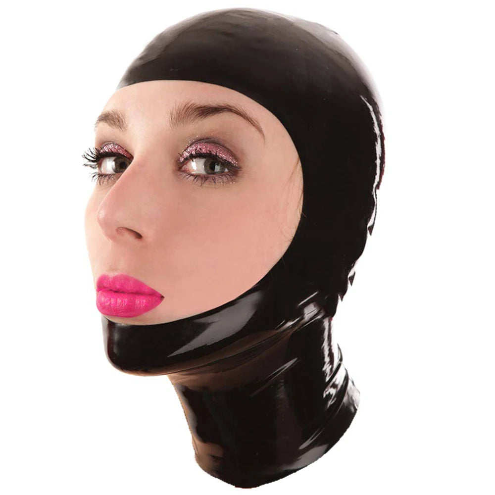 Crafted from 100% natural latex with a 0.40mm thickness, this black latex hood mask offers lightweight comfort, flexibility, and long-lasting durability. Designed with eye, nose, and mouth openings plus a convenient back zipper, it provides a secure fit while maintaining breathability and ease of wear.